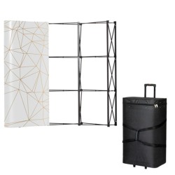 • Stand parapluie magnétique incurvé en aluminium noir • Idéal pour la réalisation d’un mur d’images • Valise de transport rigide à roulettes, sert aussi de comptoir • Médias recommandés pour le visuel : Supports pop-up • Livré avec valise rigide et ruban magnétique adhésif - sans visuel